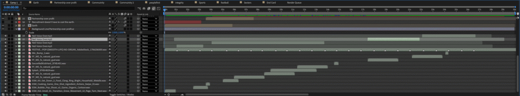 We imported both the music and voiceover into After Effects, adjusted levels so the voice stayed clear, and added beat markers to sync certain animations perfectly with the rhythm.